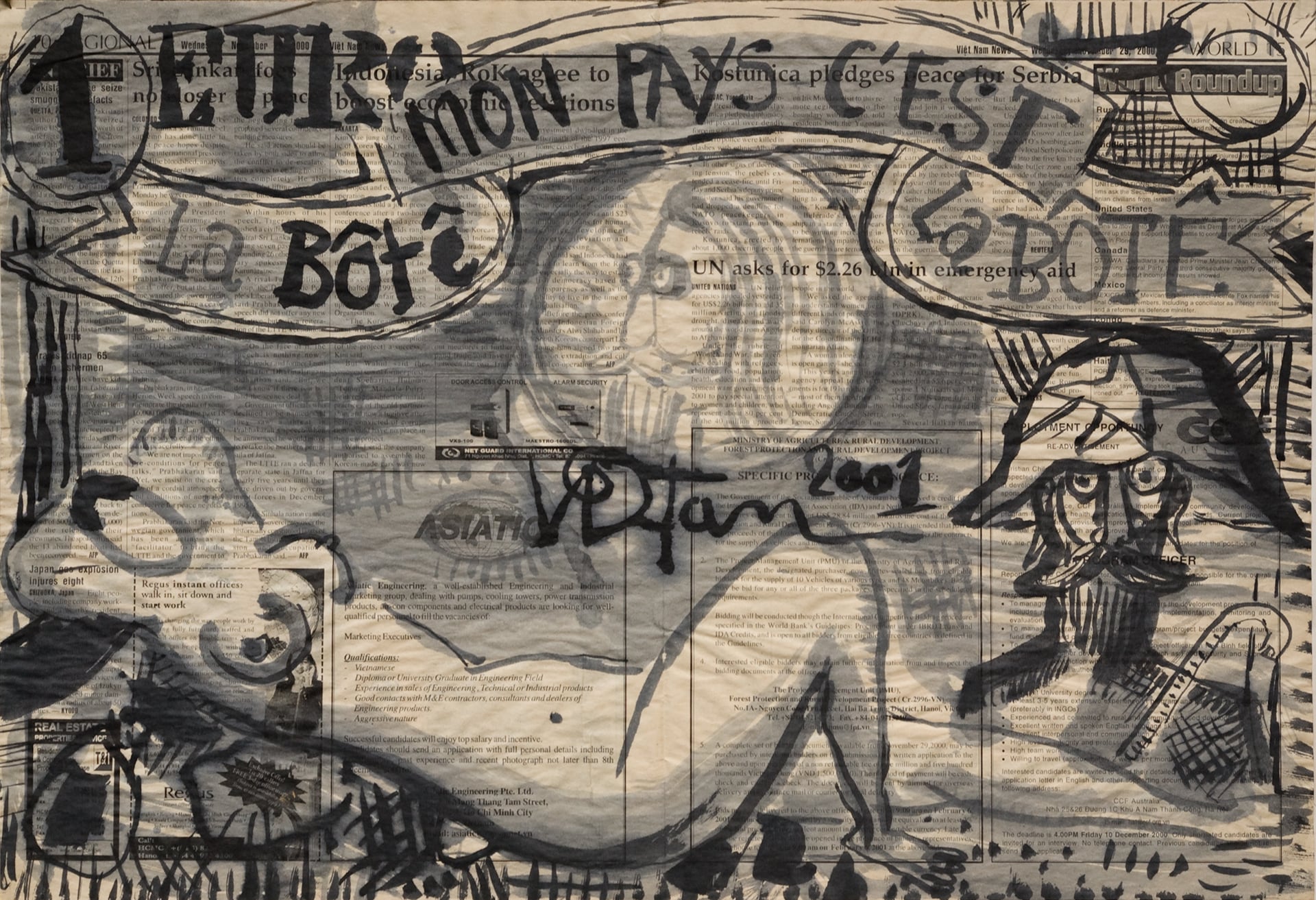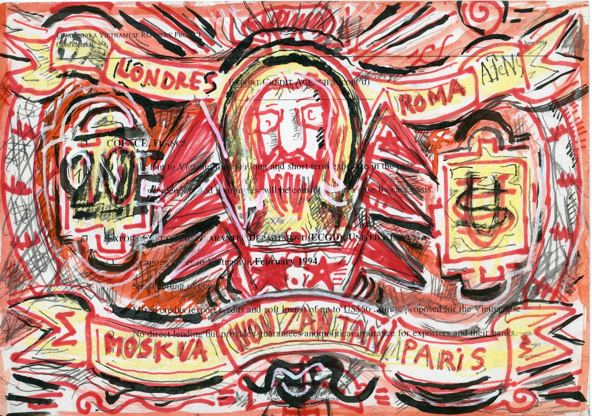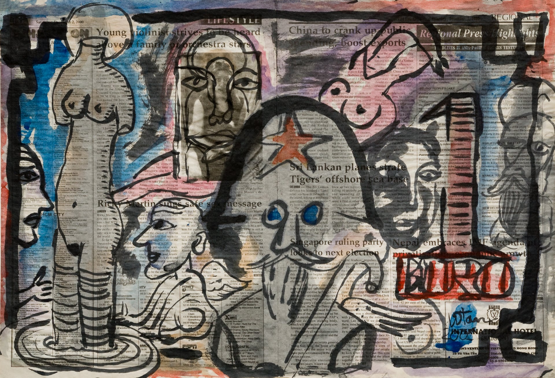Paper-currency’s trade ethos, reinforced by Tan’s iconography sourced in a wide cultural and historical pool, exposes the roving eye as in Tan’s hands euros, Hong Kong dollars, lire, pounds and the mighty USD are a forum of playful social study allowing the artist to poke a sacred national institution from a host of vantage points. Tan’s selection of money as expressive idiom relates in part to the new place of capitalism in post-Doi Moi Vietnam. ❞